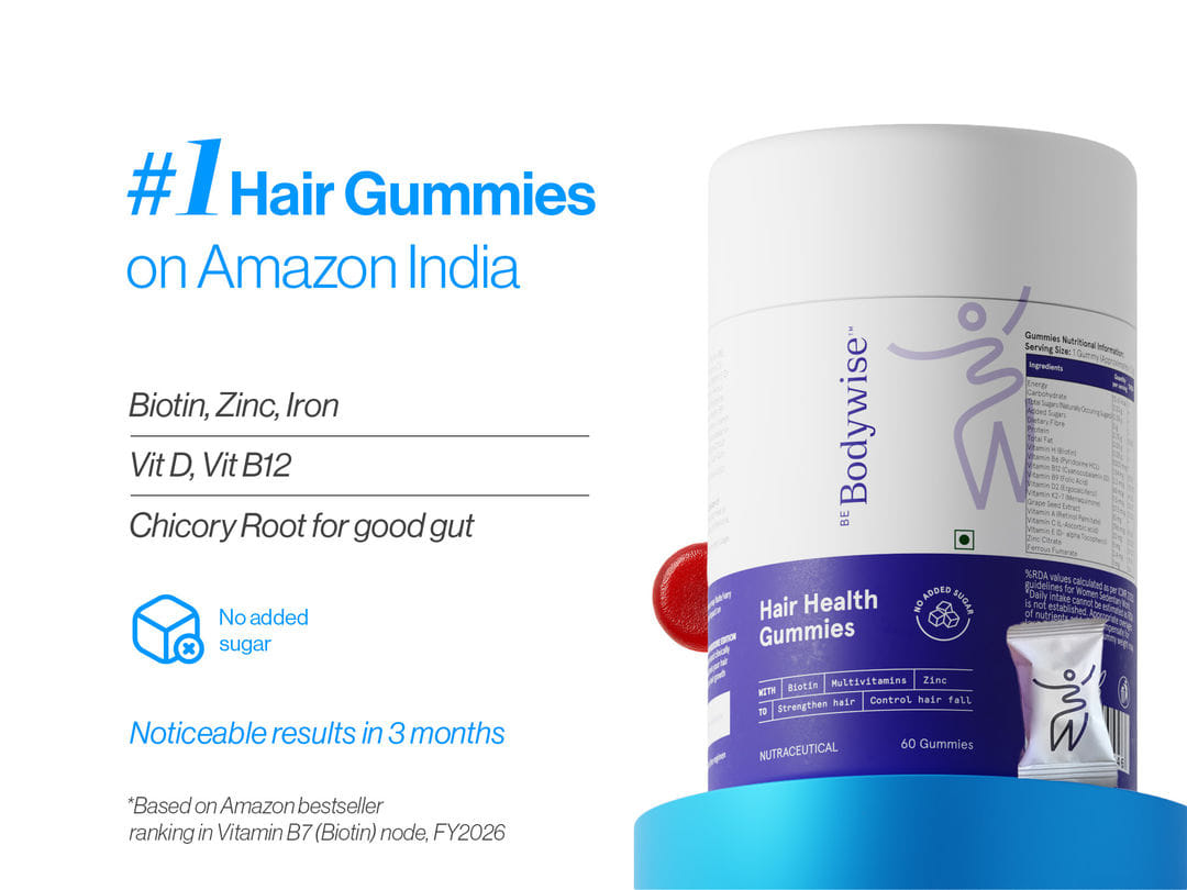 Be Bodywise Hair Gummies are packed with Biotin, Zinc & Vitamins B12, D and essential hair Multivitamins, which will give you the right nutrition to support hair strength